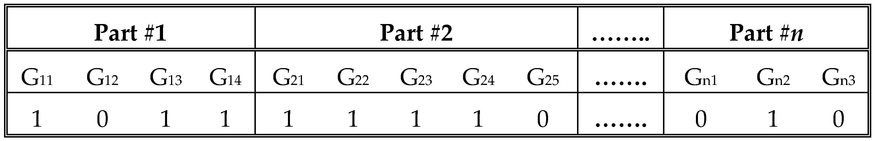 Step 2: Each chromosome is arranged in “n” parts; each part includes adjacent binary number representation for the conventional generating units, with the same reliability parameters and MW capacity.