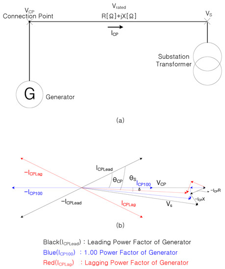 The capacity of REGs to be installed in DL is dependent on the capacity of the existing DRs in DL, the allowable load capacity of DL, the available voltage rise rate of DL, and the type of generators to be newly added. Figure 1 shows the single line and vector diagrams based on the connection point voltage when a REG is added to DL [5], and the voltage rise rate and DL voltage are described as Equations (1)–(4).