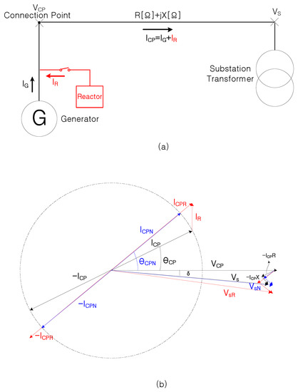 Figure 2 presents the single line and vector diagrams of DL with the reactor, where the red parts show the changes after installing a reactor. The blue of Figure 2 corresponds to in Equation (5). The limited values of , , and , shown in blue in Figure 2 that do not exceed the allowable voltage rise rate in DL are then derived. If the reactor with the value calculated from Equation (5) is installed, is the same, but and are different from and , such as in the red parts in Figure 2. Therefore, the voltage rise in DL may be higher than the allowable voltage rise. A larger reactor should be installed to cover this additional voltage rise.