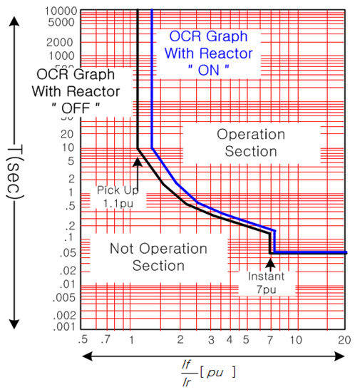 In this paper, the installation locations of the reactor are examined by the comparative analysis of the advantages and disadvantages at each location considering the necessity of re-coordination of a protection relay and the loss of generation revenue according to the installation locations. For these analyses, the reactor locations are selected firstly depending on where they are located, before or after CT1 or CT2. Therefore, there are only four locations where reactors can be installed in the plant as shown in Figure 3, and the most suitable place can be chosen among them after considering the coordination of the protective relays and economic issues. Table 1 lists the currents of CT1 and CT2 as the ON/OFF operation of reactor for each different location. The currents through CTs are not the same, so the protection relay must be coordinated differently according to the reactor ON/OFF condition. Figure 4 gives an example of the re-coordination for overcurrent relay (OCR) of CT2, when the reactor is installed at the location of ①, ②, or ③ [33].