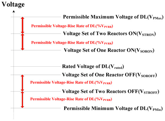 Figure 6 shows the voltage set criteria for the ON and OFF operation of the reactor, which are the permissible maximum (VPMax) and minimum (VPMin) voltages of the DL. The voltage condition (VSTRON), in which two reactors are switched ON is a value obtained by subtracting the permissible voltage rise rate (%VPVRR) from VPMax. The voltage condition (VSORON), in which one reactor is switched ON, is the value obtained by subtracting %VPVRR from VSTRON. The voltage condition for the reactor OFF will be the opposite of the ON condition.