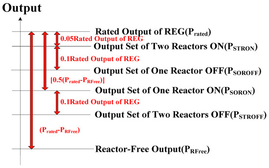 Figure 7 presents the output set criteria of REG for the ON and OFF operation of the reactor. The output condition (PSTRON) in which two reactors are switched ON is 95% of the rated output (Prated) of the REG. Half of the value obtained by subtracting the reactor-free output (PRFree) of REG in Section 3.1 from Prated is subtracted from Prated. This is the output condition (PSORON), in which one reactor is switched ON. The output condition for OFF of the reactor is below 10%Prated of the ON condition.