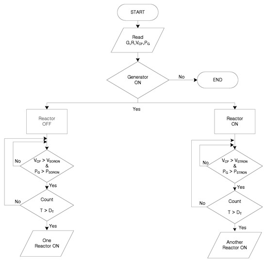 Figure 8 and Figure 9 present the flow chart for the ON and OFF operation of the reactor. If the voltage of DL exceeds VSORON and the generator output exceeds PSORON in the case of reactor OFF state, and if the duration time exceeds the setting value, one reactor is turned ON, as shown in the left part of Figure 8. If the voltage of DL exceeds VSTRON and the generator output exceeds PSTRON in case of one reactor ON state, and if the duration time exceeds the setting value, one reactor is additionally turned ON as shown in the right part of Figure 8. On the other hand, if the voltage of DL is lower than VSOROFF or the generator output is lower than PSOROFF in the case of two reactors in the ON state, and if the duration time exceeds the setting value, one reactor is turned OFF, as shown in the left part of Figure 9. If the voltage of DL is lower than VSTROFF or the generator output is lower than PSTROFF in case of one reactor ON state, and if the duration time exceeds the setting value, the reactors are all turned OFF, as shown in the right part of Figure 9.