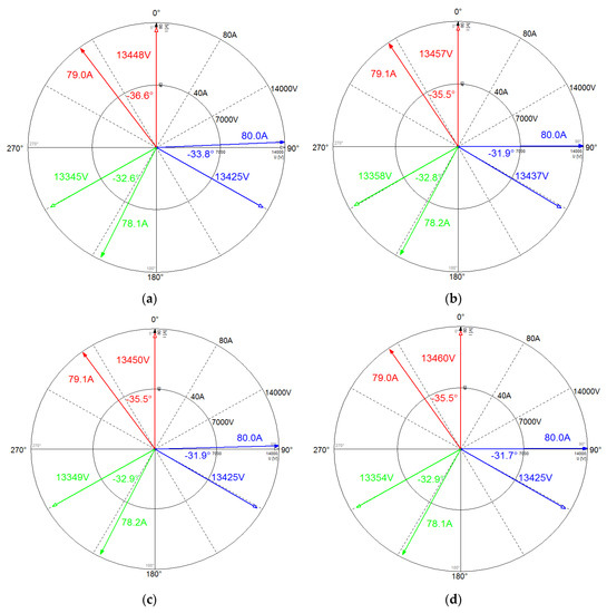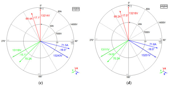 Firstly, the vector diagram of the no reactor operation and two reactors operation are compared, as shown in Figure 10a–d and Figure 11a–d. Tests are conducted at similar active outputs for a one-day interval to meet the same test conditions as much as possible. The vector diagram shows the phase voltages () and currents () at the connection point of the REG to the DL. Compared to Figure 10, Figure 11 shows that the magnitude and phase angle of the current vector are increased due to the reactor operation. The substation voltage () is calculated because the substation is very far from the power plant. The test results are applied in Equations (1)–(4) and Table 4 lists the effectiveness of the reactor operation. The substation voltages are 22,459 V, 22,449 V, 22,435 V, 22,448 V from Equation (4) and the voltage rises due to the connection of REG in the two reactors OFF state are 539 V, 549 V, 542 V, 548 V, but the reactor is not switched ON because the DL voltage does not satisfy the condition of the reactor ON. The substation voltages are 23,125 V, 23,337 V, 23,324 V, 23,331 V using Equation (4) and the voltage rises due to the connection of REG in two reactors ON state are 1 V, 3 V, 3 V, 6 V. Accordingly, the mitigations of the voltage rise are 538 V, 546 V, 539 V, 536 V with the installation of the reactor under similar test conditions.
