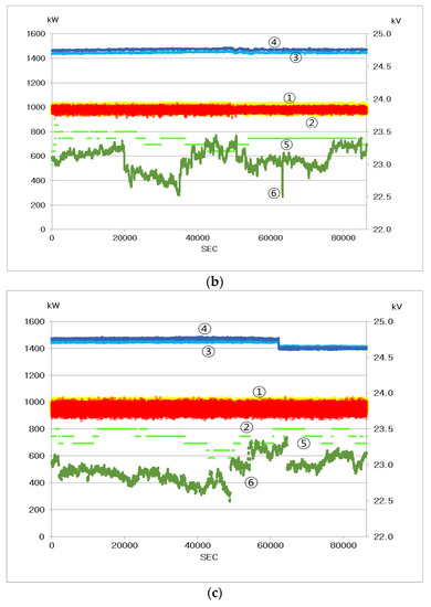 Secondly, the daily connection voltage data before and after installing the reactor are analyzed. To compare the test results before and after installing the reactor, tests are conducted on the daily-maximum generation day in the same season to provide the same condition. The excessive voltage rise occurs when the generator output is connected to the grid without a reactor so that the output-rise can be 1000 kW, which is two-thirds of the rated output. Table 5 and Figure 12a–c present the comparison data of the output active power and the daily grid voltage before and after installing the reactor. The voltage of the connection point increases with increasing the output of REGs. On the other hand, despite the increase in output, the voltage decreased due to the reactor operation. Figure 12a–c show that the generator outputs are increased by 455 kW and 494 kW on average, respectively, but the grid voltage is decreased by 56 V.