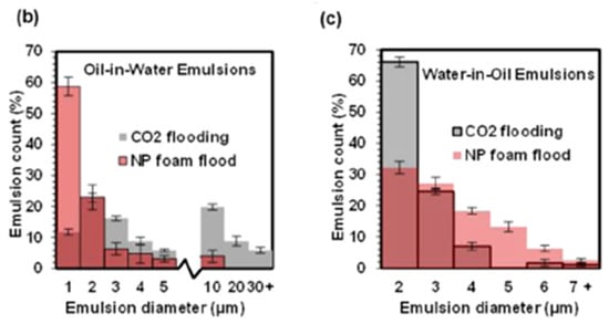 In addition to generate w/o or o/w emulsions by using NPs, the silica NPs can be used to stabilize supercritical CO2-in-water emulsion, and water-in-supercritical CO2 emulsion [63,64]. These nanoemulsions can be used for improving oil recovery, especially for CO2 flooding or CO2 sequestration because they can maintain stable under harsh reservoir conditions (high temperatures, pressures, shear and salinity).