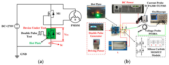 In order to analyze the dynamic performance of the PMSM drive system considering the power device characteristics, in this section of the paper we investigate the switching characteristics of a SiC MOSFET (CAS300M12BM2, CREE, Durham, NC, USA) and a Si IGBT (FF400R12KE3, Infineon, Am Campeon, Neubiberg, Germany) by a double-pulse test (DPT). The DPT setup was built as shown in Figure 1, where a DC source voltage (270 V) is assigned to a leg of the inverter, and the inductors of two phases in the PMSM are adopted as the load inductors. The lower switch of phase-leg is selected as the device under test (DUT). A high precision voltage probe (P5100A, Tektronix, Beaverton, OR, USA) and a TCPA300 current probe (Tektronix, Beaverton, OR, USA) plus a TCP303 are used to measure the voltage (VDS) and channel current (IC) of the DUT, respectively.