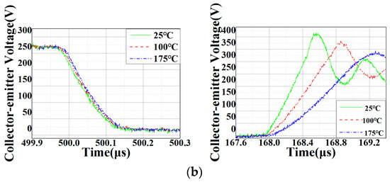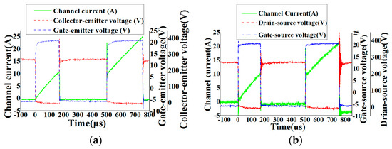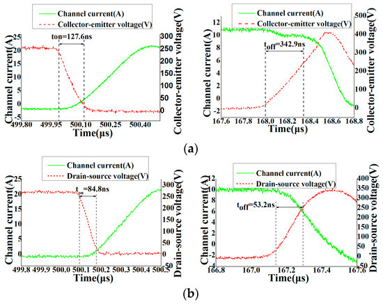 Figure 3 shows that the turn-on and turn-off times of the Si IGBT are 127.6 ns and 342.9 ns, respectively, when the ambient temperature is 25 °C and the channel current is 11A. Both the turn-on and turn-off times of the SiC MOSFET, which are 84.8 ns and 153.2 ns, correspondingly, are smaller than those of the Si counterpart.