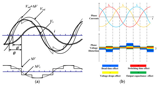 In [38,39], the phase voltage distortions of the inverter are developed, taking the dead time, switching time, voltage drop and output capacitance into account. In Figure 5a, the deviation appears in the waveform of the inverter phase voltage. Vref displays the ideal fundamental phase voltage of the inverter that would result if there were no distortion voltage effects. As the PMSM is an inductive load, the phase current waveform i lags behind Vref by an angle θ′. Since the distortion voltage increases (decreases) the inverter phase voltage for the negative (positive) half cycle of the phase current as shown in Figure 5b, the average voltage distortion over an entire cycle could be illustrated by the square wave in Figure 5a.