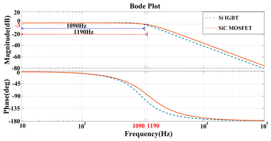 From (17), the settling time ts is directly proportional to the delay time constant τr of the inverter. Hence, the settling time of the SiC-drive system is shorter than that of a Si-drive system according to (3). According to the aforementioned analyzing results and the system parameters shown in Table 2, the Bode plot of the closed-loop transfer functions for the two systems was drawn, as shown in Figure 7. The bandwidth ωb is usually defined by −3 dB amplitude response in Bode plots for a closed loop drive system. Thanks to the superior switching characteristics of SiC MOSFET, the bandwidth of the SiC-drive system is 1190 Hz, which is higher than the 1090 Hz of the Si-drive system.
