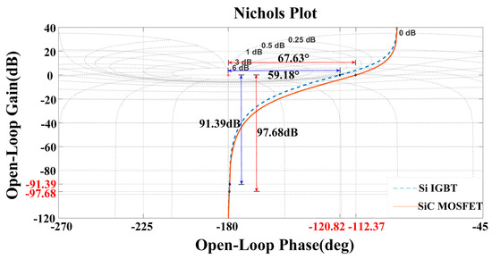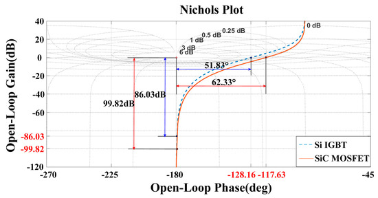 In this section, the relative stabilities of the two drive systems are investigated by experiments. The Nichols plot is drawn based on the transfer function of the drive system and experiment as shown in Figure 13. The phase and amplitude margins of the SiC-drive system are 62.33° and 99.82 dB, respectively, while the counterparts of the Si-drive system are 51.83° and 86.03 dB. A significant improvement in relative stability by adopting SiC MOSFETs can be observed from the results. In addition, thanks to the superior characteristics of the SiC MOSFET, the phase and amplitude margins can be further increased by decreasing the dead time and the switching period, whereas, the phase and amplitude margins of the Si-drive system are penalized by its limited switching speed and operation frequency.