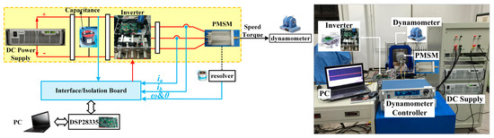 The experimental setup is illustrated in Figure 10. In order to prevent unpredictable factors from impacting the voltage and current waveforms, the same control boards based on DSP28335, the same current sensors (LEM DHAB s/14) and same PMSM with a Tamagawa resolver (TS2640N321E64) are used in the two test drive systems. An AD2S1210 resolver-digital converter with a highest accuracy of 0.24 rpm is adopted. The only difference is the power switching device: SiC MOSFET (CAS300M12BM2, Cree, 1200 V, 300 A) and Si IGBT (FF400R12KE3, Infineon, 1200 V, 400 A) are adopted.