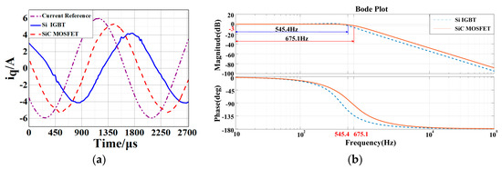 Figure 11 shows the experimental results at a switching frequency of 15 kHz and a dead time of 2 μs. Figure 11a shows experimental results of the q-axis reference current and the actual q-axis current when the frequency and the amplitude of the reference current are 545 Hz and 6 A, respectively. The actual current of the SiC-drive system presents 5.3 A amplitude and 53.8° phase lag. Meanwhile, the actual current of the Si-IGBT system has 4.2 A amplitude and 116° phase lag. The SiC-drive system manifests a faster dynamic response compared with the Si-drive system.