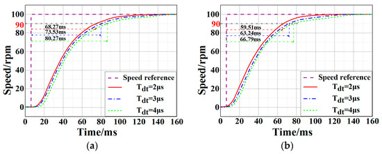 Step response of speed loop at 15 kHz with different dead time; (a) Si IGBT based system; (b) SiC MOSFET based system.