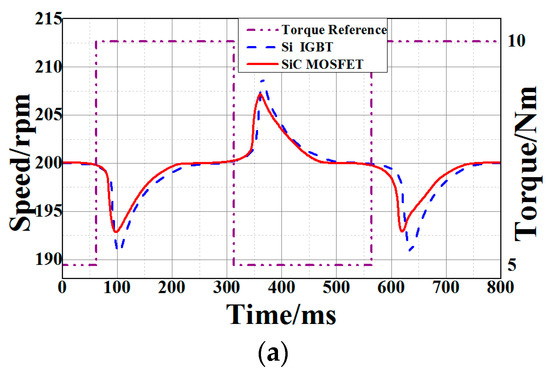 It is worth mentioning that the turn-off time of the Si IGBT is increasing as temperature rises, which will increase the delay time constant τr and decrease the gain Kr of the Si-inverter. Hence, the fast response, relative stability and robustness capability of the Si-drive system will be worse. On the contrary, the switching time of the SiC MOSFET is almost invariable under different temperatures. As a result, the SiC-drive system can maintain superior dynamic performance for a long-time operation.