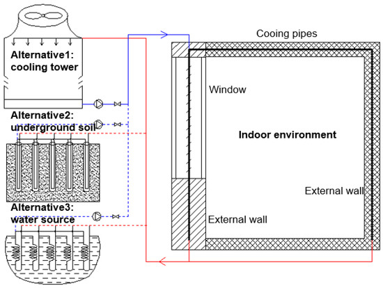 The schematic diagram of the pipe-embedded envelope is shown in Figure 1. Cooling pipes are embedded into the wall and the double pane window. Cooling water flows inside to take away the heat from the envelope. The heat transfer of the pipe-embedded structure is more efficient than the traditional indoor fan coil unit. Firstly, the heat transfer area of the pipe-embedded system is sufficient because the whole envelope can be considered as a heat exchanger. Secondly, the heat transfer coefficient of the pipe-embedded system is high. In the wall, the pipes directly contact the solid surface. In the window, the pipes directly absorb the incident solar radiation. Finally, natural energy sources can be employed directly for cooling regarding the high temperature of the window and wall. According to the climatic feature of Urumqi, DEC, IEC, and GSHE are applied as the natural cooling sources in this study.