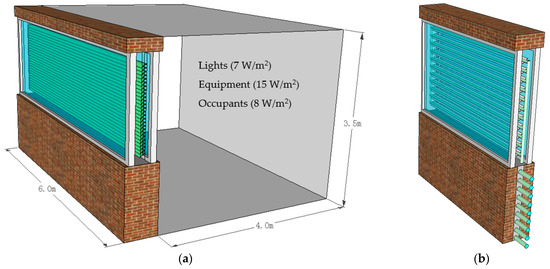 A typical office is adopted to evaluate the performance of the synthetic pipe-embedded envelope, as shown in Figure 2. The dimensions of the office are 6.0 m (length) × 4.0 m (width) × 3.5 m (height). The external envelope of the office consists of window and wall. Window-to-wall ratio (WWR) varies in different cases. The heat gain from envelope is simulated using a computational fluid dynamics (CFD) program. The indoor heat gain consists of lights (7 W/m2), equipment (15 W/m2), and occupants (8 W/m2) [22]. The working schedule of the office is from 08:00 to 18:00. All of the other settings are the same in the office with traditional and pipe-embedded envelopes except for the pipes.