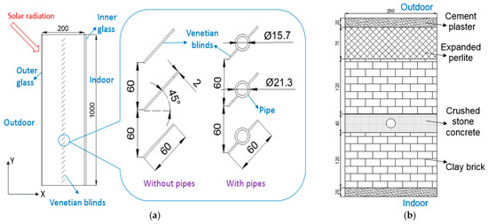 The heat transfers of the window unit and wall unit are numerically simulated, respectively. As illustrated in Figure 3, a typical double pane window with venetian blinds and a typical wall with bricks and an insulation layer are employed in the study. Cooling pipes are built in the venetian blinds of the window and the interlayer of the wall. The materials in the window are selected based on [23,24]. The glass has different characteristics in long-wave and short-wave bands. The materials in the wall are selected based on [25,26]. The expanded perlite is employed as the insulation material. The detailed information of the materials in the window and wall is listed in Table 1 and Table 2. The insulations of the window and wall are selected complying with the thermal insulation standard in Urumqi [22].