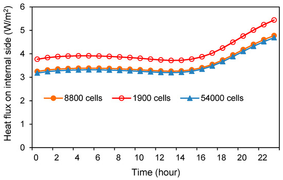 Structured quadratic cells are generated in the main domain except for a part near the round pipes and venetian blinds. The mesh independence for the wall has been checked by developing 54,000, 8800, and 1900 cells. The heat transfer through the wall in a day is simulated, and the comparison of heat flux on the internal surface of wall is illustrated in Figure 4. This indicates that the results from 54,000 to 8800 cells are very close, while the results from coarse cells have a relative error larger than 10%. Thus, the mid-density mesh is employed, whose edge length of the cells is 6 mm, approximately. Similarly, the mesh independence for the window has been checked by developing 300,000, 140,000 and 60,000 cells, and the mesh with 140,000 cells is eventually employed, whose cell edge is about 10 mm. The configuration of the adopted mesh is shown in Figure 5.
