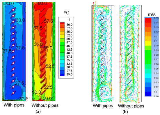 According to the summer design parameters in Urumqi [29], a typical weather condition is selected to investigate the performance of the cooling pipes. The outdoor temperature is 33 °C, the water temperature is 24.5 °C, and the solar radiation on the external glass is 600 W/m2. The temperature and velocity fields of windows with or without pipes are shown in Figure 6. In the traditional double window without pipes, the blinds are significantly heated because of the strong solar radiation. Thermal stratification occurs in the cavity of the double window, the highest temperature of the air in the top area is even more than 50 °C. The temperature of the blinds is as high as 60 °C, which is corresponding to the experimental results in [16], and a part of the bottom is also hot due to the slant solar radiation. Thus, although the direct heat gain caused by the short-wave solar radiation is reduced, the heat conduction of the internal glass and the long-wave solar radiation from the shading device are still considerable. According to the simulation, 37.3% of the solar energy will transfer into the room. However, with the cooling effect of the embedded pipes, the overall temperature of the novel double window is greatly decreased. The highest air temperature is less than 30 °C. The temperature of blinds is only about 26 °C, and the blinds no longer transfer heat to the indoor space. The neighbor of the shading device even becomes a cool region. In this condition, 60.1% of the heat gain from solar radiation is directly taken away by the cooling pipes, and only 12.2% of the incident radiation transfers into the room eventually. Nevertheless, the heat dissipation to the ambient environment in the pipe-embedded double window is less than that of the traditional double window because the temperature of the pipe-embedded double window is much lower. Thus, the cooling pipes need to deal with more heat. However, its energy-saving potential may still be promising considering the production of cooling water is very efficient compared with the chiller.