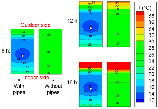 The temperature field in the envelope at different times during the conditions with or without pipes is illustrated in Figure 7. In the traditional wall without pipes, the temperature of the external surface is heated up from noon to night. Especially around 16:00, the highest temperature of the envelope is over 38 °C. The temperature of the internal surface is always more than 26 °C. With the embedded cooling pipes, the temperature of the envelope is significantly reduced. As shown in Figure 7, the heat transferred to the room is effectively reduced by the pipes, and the temperature of the internal surface is about 20 °C, which is even much lower than the room temperature. Thus, the cooling pipes not only decrease the external heat gain through the wall but also absorb the internal heat.