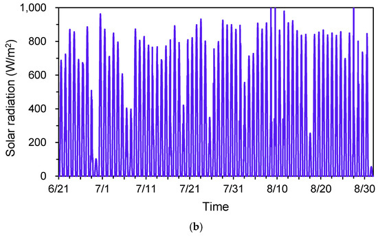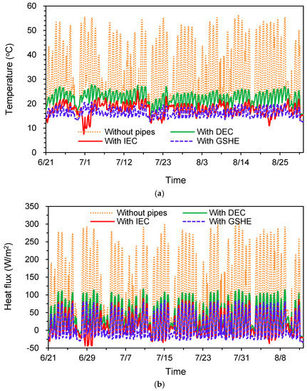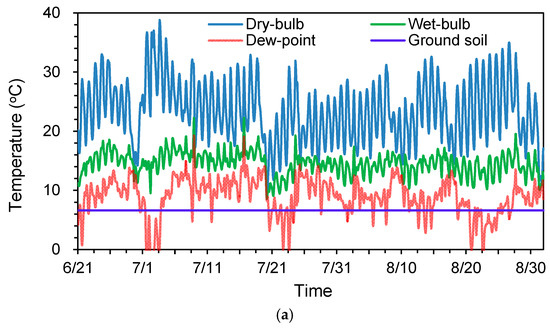 The climatic data of Urumqi in summer is illustrated in Figure 8. Urumqi is a typical city in Central Asia. The ambient dry-bulb temperature is around 30 °C and the highest temperature is close to 40 °C. The solar radiation here is very intense, and the highest horizontal solar radiation is more than 1000 W/m2. Evaporative cooling is efficient here because the wet-bulb temperature and dew-point temperature are low. The average soil temperature is only 6.6 °C. Thus, DEC, IEC, and GSHE are considered as three alternative natural cooling sources in this study. The cooling effects of different sources in a complete summer are simulated and compared.