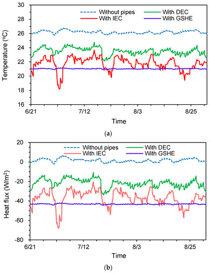 The temperature of the internal surface of the wall is shown in Figure 10a. The temperature of the traditional wall is more than 26 °C, but the temperature of the pipe-embedded wall is only 21 to 24 °C. The wall panel is also able to cool the indoor environment through radiative heat transfer. The thermal comfort of occupants can be improved because the mean radiant temperature is reduced. The hourly heat flux on the internal surface of the wall is illustrated in Figure 10b. With respect to the traditional wall without pipes, the heat flux varies from 0 to 10 W/m2. The heat flux is small compared with window because the insulation of the wall is better. In addition, the effect of radiation on the wall is relatively slight. However, with the built-in pipes, the heat flux becomes a negative value. The external heat cannot transfer into the room, while the internal heat is taken away by the cooling water. The cooling pipes have a similar effect as a radiant cooling panel in these conditions. The average seasonal heat flux is around −21.7 W/m2 when utilizing DEC, and the heat flux is even less when adopting IEC, which is only −36.9 W/m2. The effect of GSHE is close to that of IEC, whose average heat flux is −43.2 W/m2. In addition, due to the water temperature from GSHE being nearly independent of weather, the heat flux of the wall is very stable. The cooling capacity of these pipe-embedded walls is satisfactory.