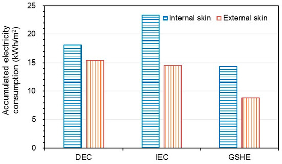 Traditionally, glass with good insulation (e.g., double glazing) is employed as the internal skin of a double pane window to reduce the heat conduction from the hot air cavity to the room. However, with the cooling effect of pipes, the air cavity is no longer hot. Thus, if we adopt the insulated glass to the external skin of a double pane window, the heat dissipation through the external skin can be reduced while the heat flux through the internal skin is almost constant. The seasonal electricity consumption for a window unit is shown in Figure 11. The insulated glass is placed in the internal or external skin of a window. The electricity consumption of the window with internal insulation is always higher irrespective of the cooling source. Especially for IEC and GSHE, the cooling water is cold, and the heat dissipation of the external skin is considerable. Hence, it is suggested to insulate external skin. In addition, by this method, the effectiveness of pipes (η) is increased to 60% because the cooling energy from pipes is decreased.