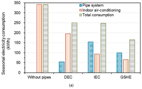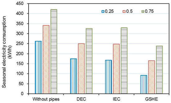 The seasonal electricity consumption of the pipe system and the indoor air-conditioning system in a typical office is shown in Figure 12. The WWR of the office is 0.5. The results are the average values of four orientations E, S, N, W. The accumulated heat gain of the envelope without pipes is 499.1 kWh, which takes up nearly a half of the total cooling load. This indicates the importance of improving the performance of the envelope in this region. The total electricity consumption in DEC and IEC are almost the same, with a reduction of 27% compared to the traditional system. However, their proportions of the components of electricity consumption are different. The consumption of indoor air-conditioning in IEC is much less than that in DEC because the water temperature in IEC is much lower. However, the electricity consumption for producing cooling water in IEC is much higher because its EER is lower. Overall, DEC is more suitable, considering its lower investment. The performance of GSHE is the best, where, ε is larger than 50%. The consumption of indoor air-conditioning in the GSHE condition is reduced by 81%, and its electricity consumption for the pipe system is not as high as that of IEC. In addition, GSHE does not consume extra water, which is beneficial for dry regions like Urumqi. The high efficiency of GSHE is because of the low soil temperature in these regions.