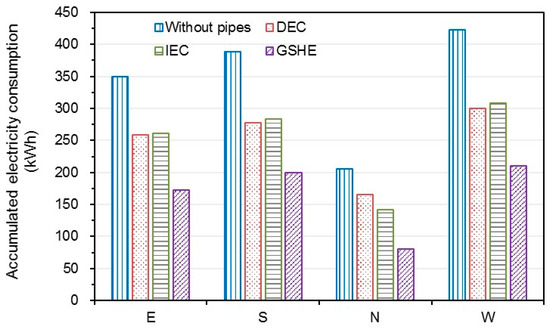 The solar radiation varies in different orientations. The accumulative radiations in the working time in summer are 163, 160, 167, and 36 kWh/m2 for E, S, W, and N orientations, respectively. It is obvious that the sunshine is stronger for E, S, and W, whereas it is weak for a N orientation. In addition, radiation is not the only factor that affects the heat gain. The average ambient air temperature is 21.7 °C from 8:00 to 11:00 and 28.0 °C from 15:00 to 18:00 in summer. Thus, it is very beneficial for the heat dissipation of east orientation because it receives radiation mainly in the morning. The seasonal electricity consumption of the office in different orientations is illustrated in Figure 13. The WWR of the office is 0.5. The results indicate that cooling pipes are effective in each orientation. The stronger the solar radiation is, the greater the reduction of electricity. However, the reduction rates of electricity consumption are close in different orientations. It is not necessary to embed the pipes for the north window because the solar radiation there is weak.