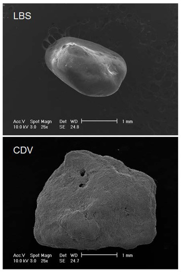 Scanning electron microscope images of LBS grain (top) and CDV granule (bottom) indicating their outline.