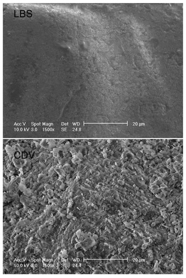 Close image from scanning electron microscope of LBS grain (top) and CDV granule (bottom) indicating their surface characteristics.