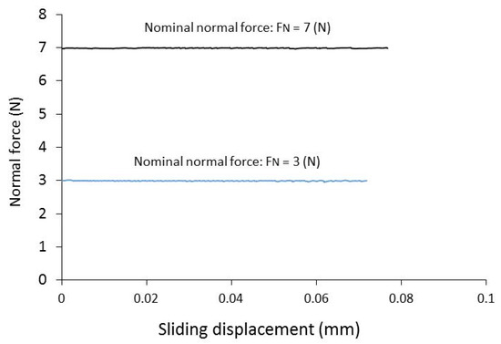 The apparatus used in the study for the micromechanical sliding tests was designed and constructed by Senetakis and Coop [10] and later upgraded by Nardelli and Coop [24] and Nardelli et al. [8]. An image of the apparatus is given in Figure 3 indicating some of its major components. This system works in three perpendicular directions, allowing two grains of sand size to be in contact under a controlled normal load and one grain is sheared over the surface of the other grain, following relatively small shearing paths of the order of about 50 to 300 microns. Typically, the normal (vertical) load is applied in a force-controlled manner and the shearing in the tangential to the contact direction is applied through a force- or displacement-controlled type [5,6,7,10,11]. Typical plots of the normal load (FN) against the horizontal (sliding) displacement during micromechanical tests are given in Figure 4. The data demonstrate the excellent performance of the apparatus in maintaining stable magnitude of the normal load while the shearing test is in progress. Note that the particular example data illustrated in Figure 4 were conducted on pairs of LBS grains under a sliding velocity of 0.08 mm/h. It is also noticed, as also mentioned in [10], that the apparatus is designed in a way that it can apply normal forces to the grain contacts of very small magnitude, in general in the range of 0.5 to 10 N, approximately. These forces are much lower in magnitude in comparison to the typical working loads in soil mechanics experimentation. This is because DEM studies have shown that the expected normal loads developed at the contacts of sand grains in typical geotechnical engineering applications and confining pressures between about 100 to 500 kPa, would be relatively small, in general less than 5 N [25].