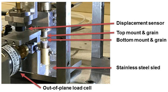 A close-up view of the apparatus during the setup of experiment on LBS grains is given in Figure 5. Note that the grains are set prior to the shearing test, with an apex-to-apex type of contact. This configuration has allowed the systematic study of grain contact stiffness [5,6,7,10,11]. Stiffness could not be captured, for example, with the previous design by Cavarretta et al. [4]. That previous apparatus could allow the grains to be initially positioned with their centroids forming an angle with respect to the horizontal. The design of this new generation micromechanical apparatus by Senetakis and Coop [10] with a number of upgrades over the recent years by Nardelli et al. [8] and Nardelli and Coop [24], allowed the initial apex-to-apex configuration without major difficulties in capturing good quality tangential force–displacement test data. In addition, stick slip phenomena have been minimized [4,26], because of the high stiffness of the new apparatus in the different directions (i.e. direction of shearing, vertical direction and out-of-plane direction). Typical setup of CDV granules prior to the application of a shearing test is given in Figure 6 indicating the two major steps in conducting this type of experiments; (1) application of the normal (vertical) load and (2) shearing of the grains in contact.