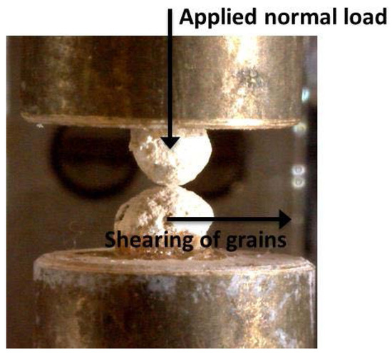 Note that for each given set of grains, after the completion of the shearing test at a given nominal normal load, the contact was lifted off, the lower grain was placed to its initial position through a backward movement of the horizontal micro-stepper motor, and the same grains were set for a new test moving in a downward manner the upper grain reaching again the contact between the grains. Thereafter, a second shearing test was conducted following the same shearing path. It is assumed, based on this process and that the compliance of the system is maintained in the out-of-plane direction, that the second, or subsequent third and fourth shearing, results in testing the grains with repeating cycles maintaining the same contact area and shearing path for the total set of tests for the given pair of grains [5]. This allows a study into the effect of repeating loading (i.e., repeating shearing) on the frictional response of the LBS and CDV granules.