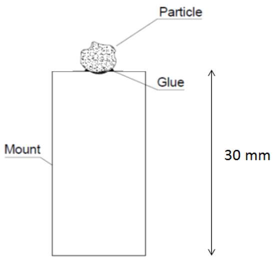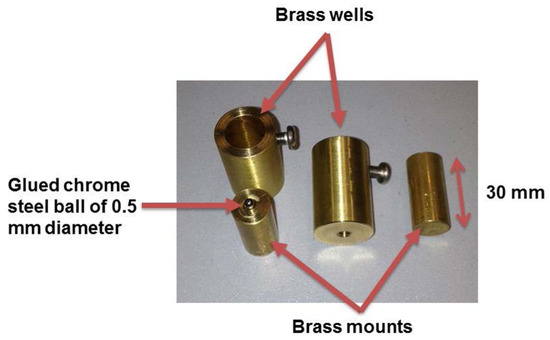 The grains are initially glued onto brass mounts of about 10 mm in diameter. These mounts are fixed into brass wells, as described by Senetakis and Coop [10] with a lateral screw used to support the rigidity of the interface mount–well. Typical image of the brass mounts and wells is given in Figure 8. Note that the free surface of the mounts is manufactured with a small groove which allows the grain to be better fixed onto the mount and the glue to cover properly the bottom and a part of the surface of the grain avoiding possible contamination of the top surface of the grain where friction and stiffness are measured. The typical configuration of the system mount–glued grain is schematically illustrated in Figure 9 (after Senetakis et al. [6], modified by the authors).