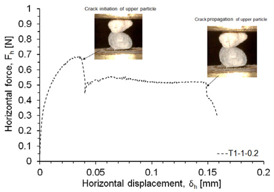 In the study, eight experiments were conducted on different pairs of grains, as summarized in Table 1. Seven tests were conducted on LBS pairs of grains and one test was conducted on CDV granules. All the tests were conducted applying a target (nominal) normal load in the range of 1 to 10 N for the LBS grains and at a nominal normal load of 0.5 N for the CDV granules. Note that the CDV granules are very breakable and the applied normal loads can be, in general, in the range of 0.5 to 1.5 N. For relatively high speeds of shearing or in some of the trials by the authors to set CDV granules for the experiments, the grains break during the application of the normal load or during the shearing test. Thus, it is in general difficult to conduct complete tests for this type of material. A typical plot of tangential (horizontal) force–sliding displacement during a test on CDV granules with occurrence of breakage of the grains during the shearing is given in Figure 10. Note the abrupt drop of the horizontal force at a displacement of about 40 microns due to the crack initiation in the upper grain. At a displacement of about 150 microns, due to the progression of increasing width of the crack of the upper grain, there was observed a second drop of the horizontal force. In such cases, the test could not be considered reliable. The testing program summarized in Table 1 included experiments for which the shearing was conducted smoothly without occurrence (particularly for the CDV pair of granules) of any notable damage or crack initiation to the granules.