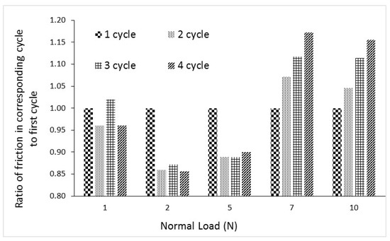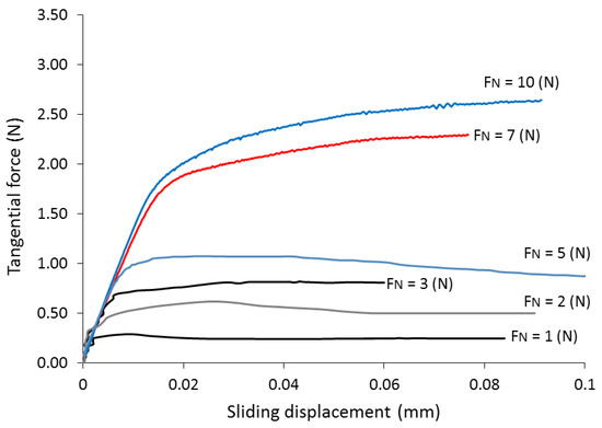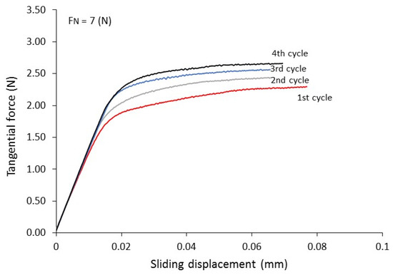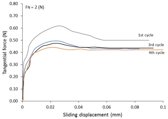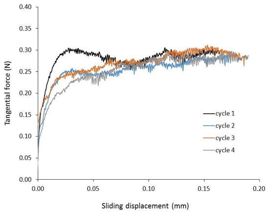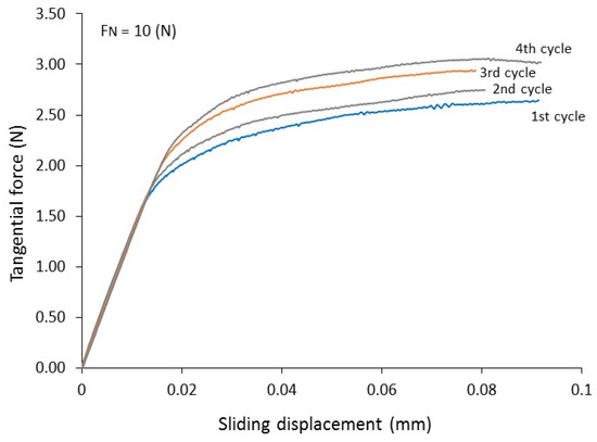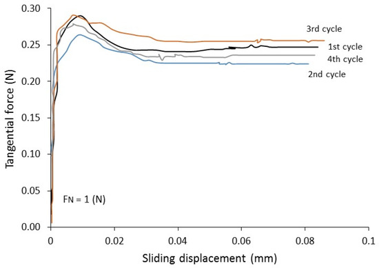 Figure 13, Figure 14, Figure 15 and Figure 16 show the effect of repeating the shearing test to the same pairs of grains at normal loads of 1, 2, 7 and 10 N, respectively. At a normal load of 1 N, there was not observed any clear effect of the repeating shearing on the tangential force–displacement relationship and thus, the inter-particle coefficient of friction. At a normal load of 2 N and a given sliding displacement, there was observed a slight drop of the tangential force, and thus the mobilized inter-particle friction, when the shearing test was repeated from the first to the forth cycle. However, between the second and forth cycle, the curves converged. Note also that at these small normal loads of 1 and 2 N, a peak state was apparent, which was more pronounced at FN = 1 N. At a normal load of 7 and 10 N (Figure 15 and Figure 16), there was not reached a peak state during the shearing of the grains and the sliding continued with decreasing rate of tangential force increase, reaching a fairly steady state of sliding. Note that for these greater normal loads, the repeating shearing tests led to an increase of the inter-particle coefficient of friction. Figure 17 gives a summary, in terms of histograms, of the effect of the repeating shearing tests on the dynamic inter-particle coefficient of friction. These results illustrated the different responses of the LBS grain contacts at small normal loads (1 to 5 N) and greater normal loads (7 and 10 N).