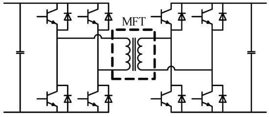 The case study in this paper is performed based on a 1.5 kV, 35 kW, 1 kHz core-type MFT used in a subunit of 10 kV EPT []. EPT is a new type of power transformer. Some new functions can be obtained by EPT, including providing high quality electric energy to the consumer and improving the dynamic performance of the power grid []. The main circuit structure of the 10 kV EPT can be found in []. The harmonic content and efficiency are two important indicators for EPT. The switching losses increase and the efficiency decreases with increasing switching frequency. The 1 kHz switching frequency is adopted since it can fulfill the design requirement of harmonic content for high voltage high power EPT, and desirable efficiency can be achieved. Therefore, the switching frequency for the MFT is 1 kHz. The MFT works in a dc-dc converter as shown in Figure 1, and the working voltage of this MFT is 1 kHz square wave with low frequency ripple.