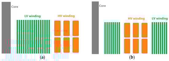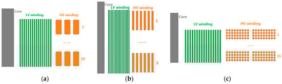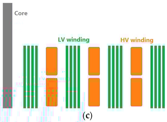 Figure 8a shows the structure of a typical non-interleaved winding N-1. The foil conductors are adopted in LV winding, and the flat copper wires are used in HV winding. Figure 8b,c illuminates the structures of two kinds of interleaved windings, I-1 and I-2 respectively. It can be seen that the wire types of the three windings are the same.