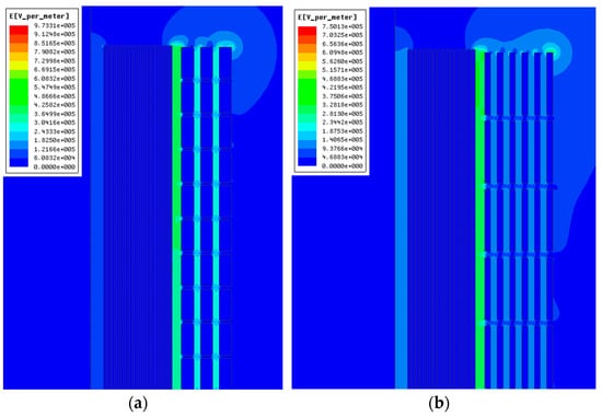2-D finite element models of the six winding structures are established using ANSYS software. The insulation distances between winding layers are 1 mm and 0.3 mm for HV and LV winding layers respectively, and the insulation distance between HV and LV windings is 1.5 mm. A maximum excitation voltage of 1500 V and 384 V are given to HV and LV windings respectively. The excitation voltage decreases from one turn to the next turn, from up to down and from outer to inner. Figure 5a–c and Figure 6a–c show the electric field distributions of the six windings.