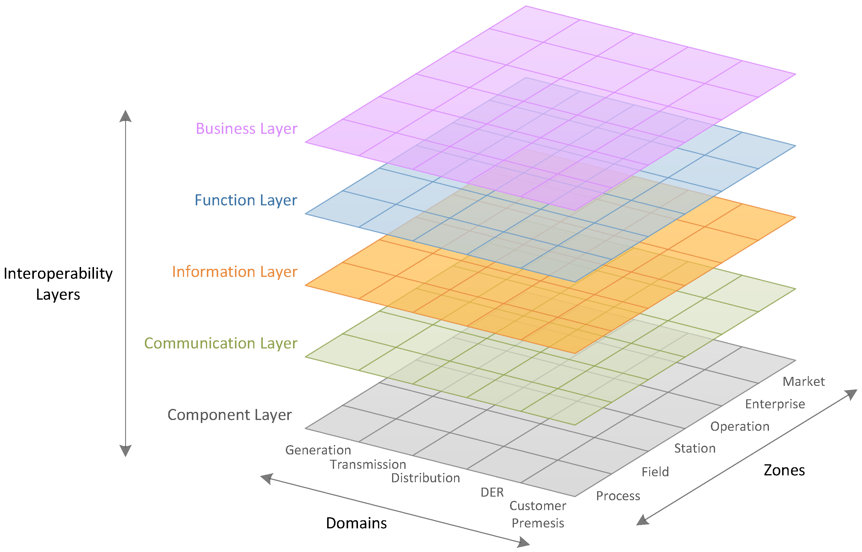 SGAM was created as a result of the “European Commission M/490 Standardization Mandate to European Standardization Organizations (ESO)” [14]. It provides a structured approach for modeling smart grid use cases. The basis for SGAM is a three-dimensional framework consisting of domains, zones, and layers. In the domains, the traditional layout of the electrical energy infrastructure can be found: generation, transmission, distribution, DER, and customer premises. The zones depict a typical hierarchical power system management: market, enterprise, operation, station, field, and process. These two axes form the component layer. On top of the component layer, four interoperability layers are placed: the communication, information, function, and business layers [8]. An overview of this three-dimensional model is provided in Figure 1.