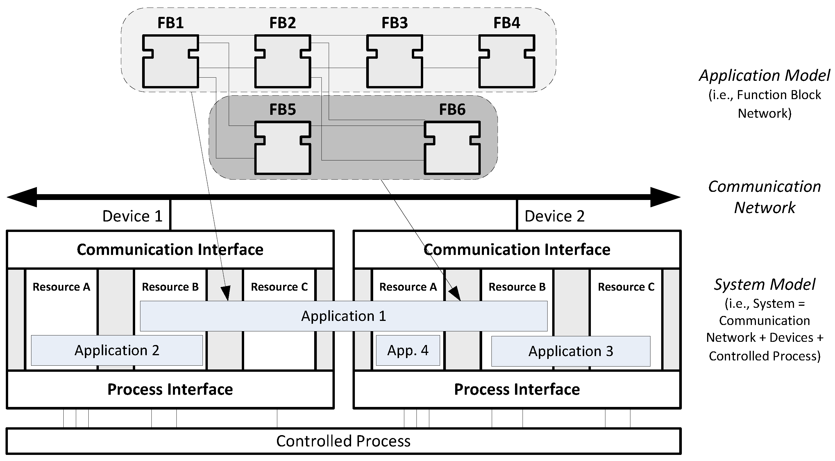 The core modeling elements of this automation approach are so called Function Blocks (FB) that encapsulate modular control software. Multiple FBs connected together into an FB network make up an IEC 61499 Application. The IEC 61499 FB model is based on its predecessor IEC 61131-3 [19] but uses events for defining the execution flow. Once an “Application” has been defined it can be deployed to field devices, called “Devices” in the standard [18]. In Figure 2 an overview of the main IEC 61499 elements is provided.