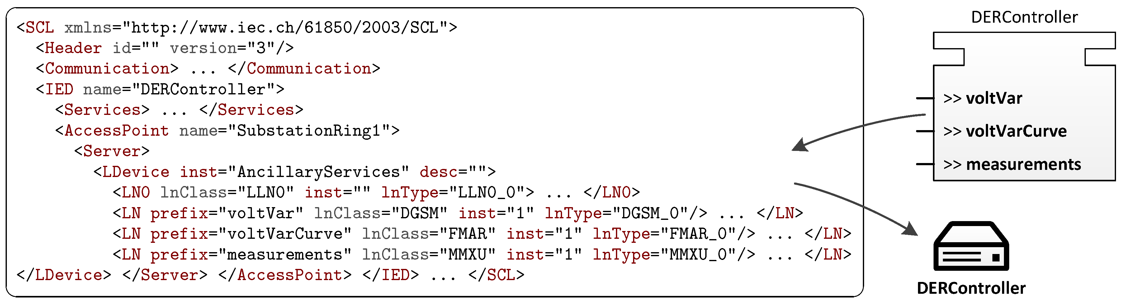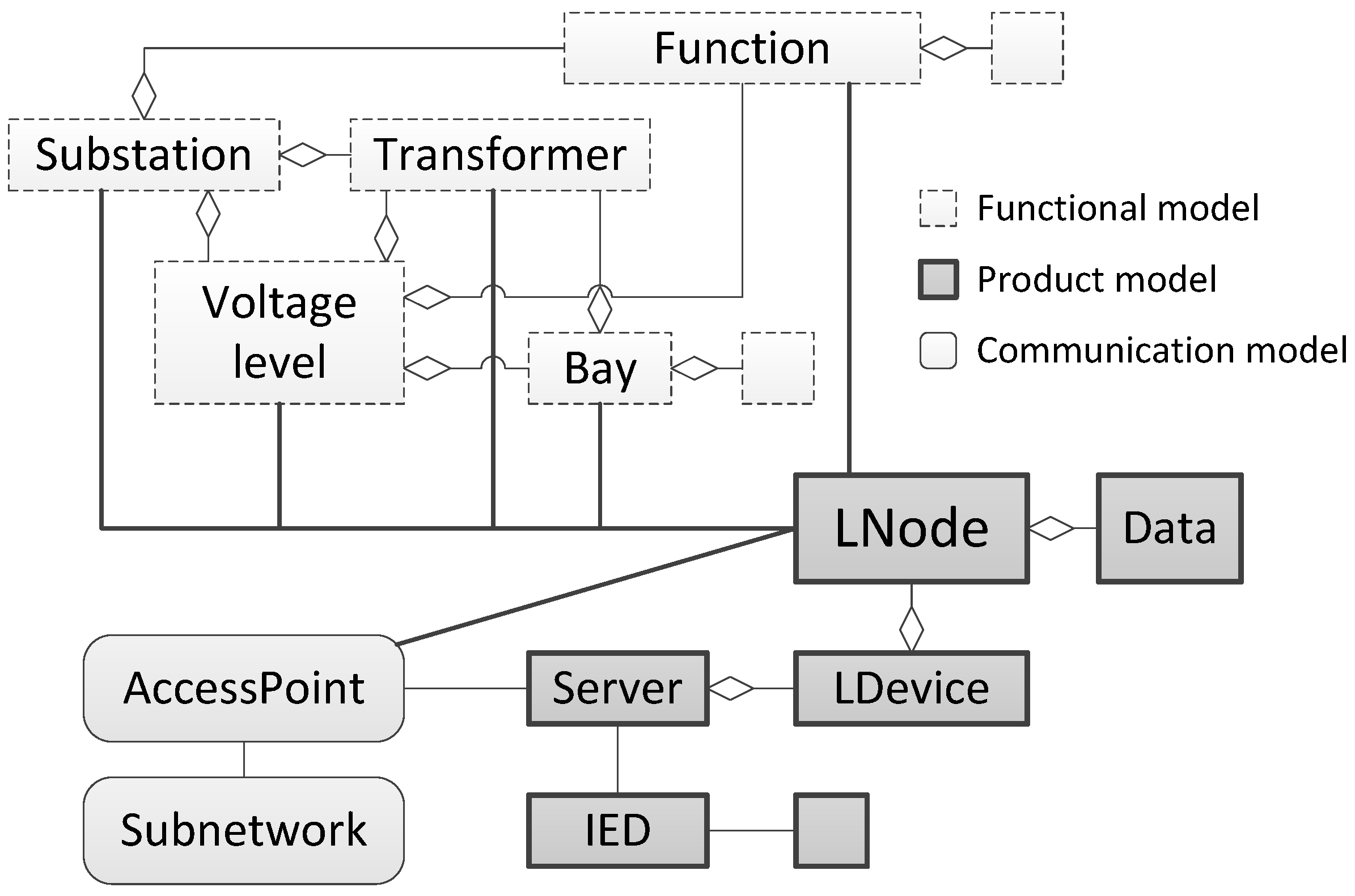 Logical Nodes (LN) are the main parts of IEC 61850 and are used to model power system components (e.g., switches, transformers, inverters) as well as power system functions (e.g., measurement, protection, voltage control). LNs can be grouped together into Logical Devices (LD), contained in IEDs, providing a kind of structural modeling. For configuration of IEDs, the XML-based System Configuration Language (SCL) is provided. It described functions of IEDs using the LD and LN definitions as well as the data exchange between devices in a formalized way [21]. Figure 3 shows the main modeling objects provided by IEC 61850.
