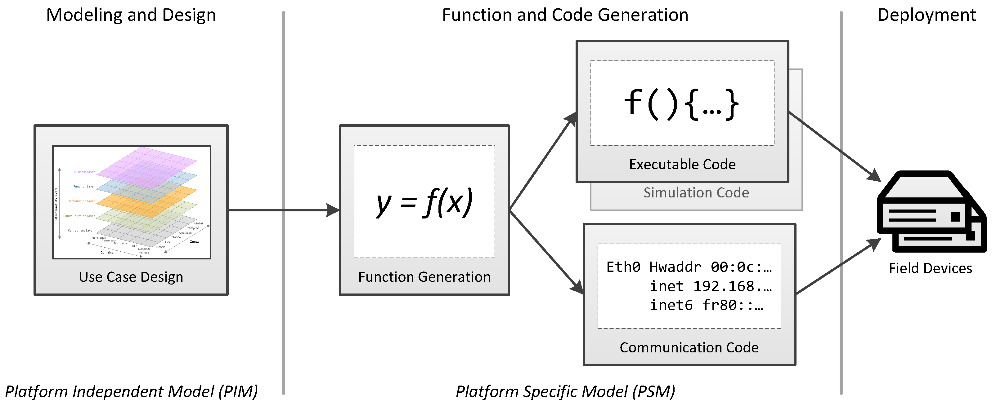 In the modeling and design phase, a use case design is made. For this purpose, the layered approach of SGAM is used as a reference. In this phase it is also possible to specify functions. In the second phase, function and code generation, the first step is a function generation part. In this step, functions that have been initially specified in the use case design phase are further developed. This can be an automatic process (e.g., based on standards and other documented functions [21]) or a manual process. In this paper, the focus will be on the manual process.