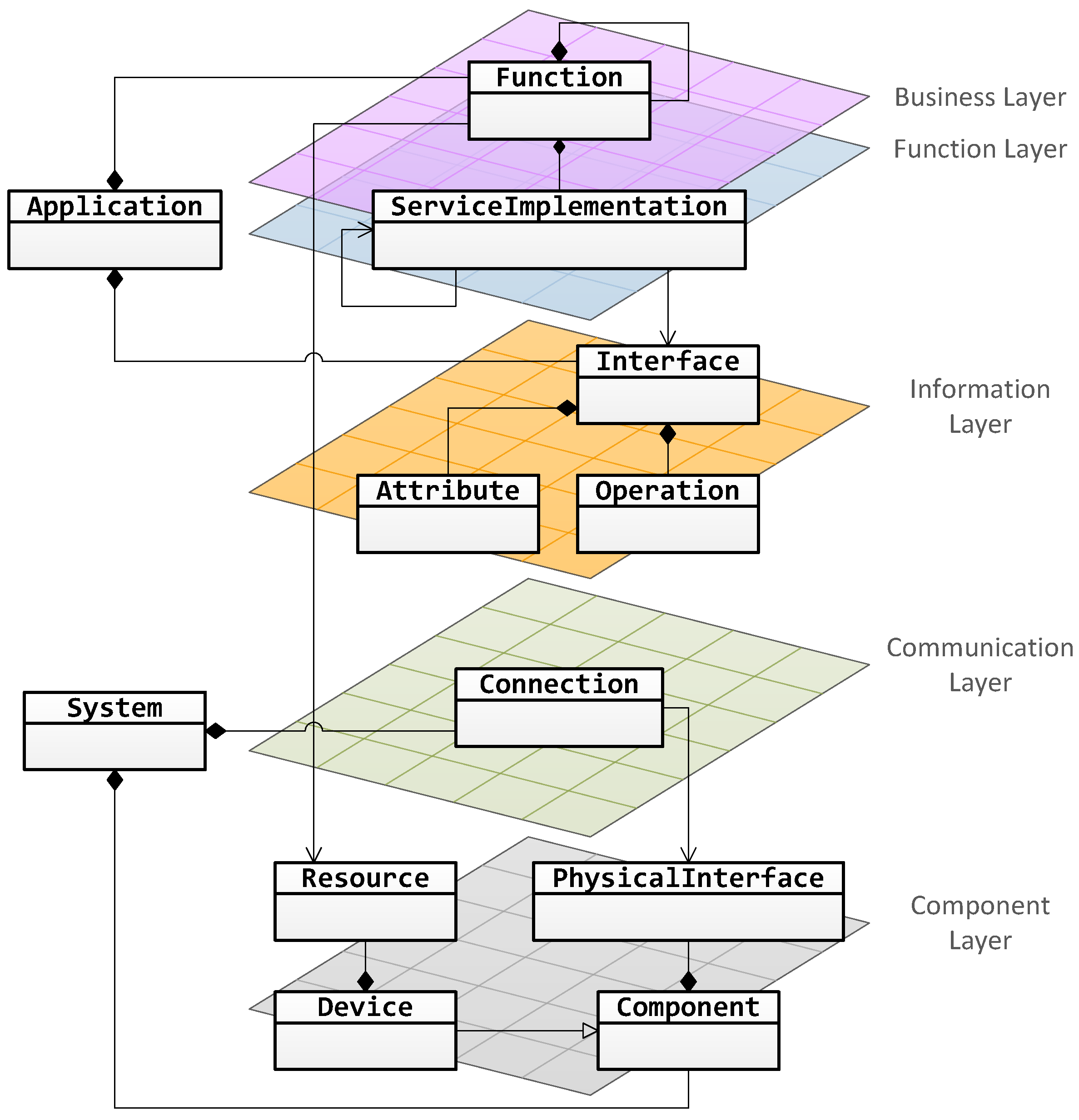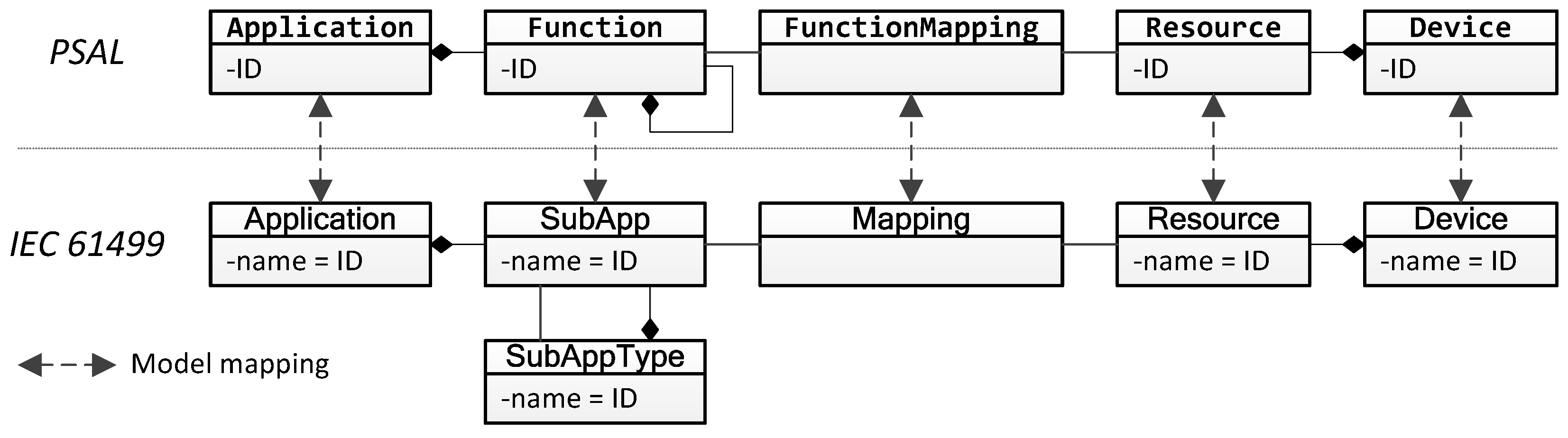 Additionally to the SGAM methodology, PSAL provides the Application and the System model parts. Together they form a further abstraction layer. The System contains the specification of the component and the communication layers. The Application contains the specification of the business, function, and the information layers. In order to associate the Application model with a System model, Functions are mapped to Resources. A Function-Resource mapping defines in which Resource a specific Function is executed. With this mapping also requirement ER5 is fulfilled.