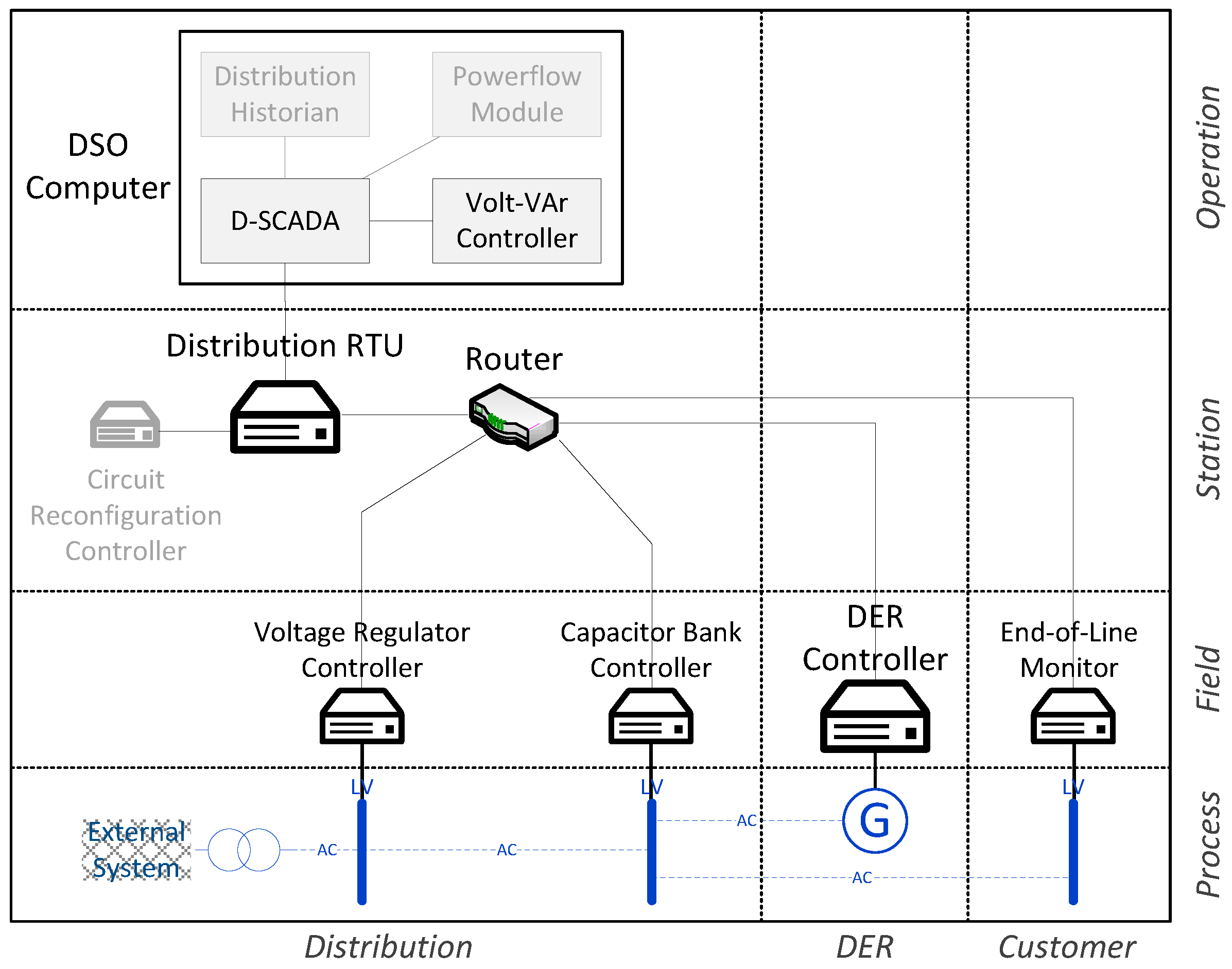 - CEN-CENELEC-ETSI Smart Grid Coordination Group. Reference Architecture for the Smart Grid; Technical Report; CEN-CENELEC-ETSI Smart Grid Coordination Group: Brussels, Belgium, 2012. [Google Scholar]