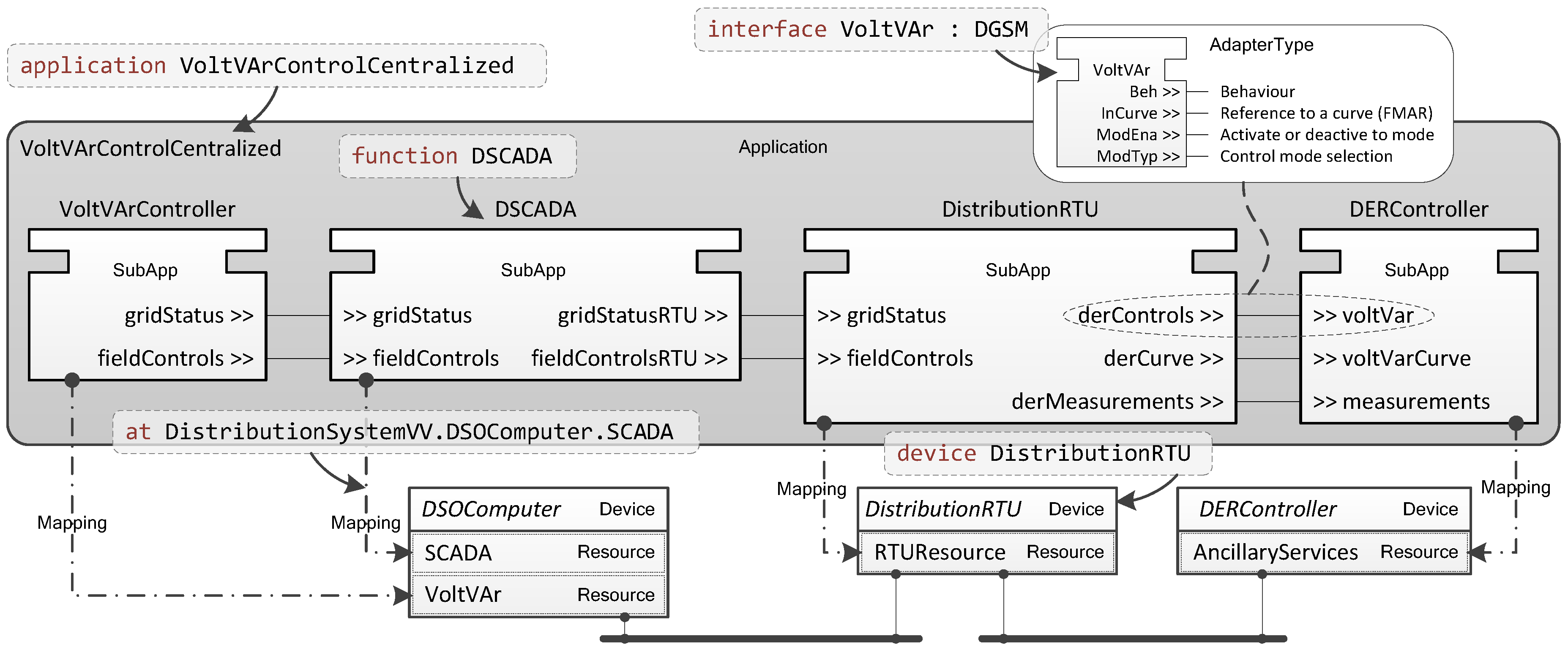In SGAM, the placement of component and functions into domains and zones is introduced. This placement helps to structure a use case, but is mainly for documentation purposes and has no direct influence on the realization. With a textual implementation of PSAL, the definition of domain and zone through spatial layout is not an option. Nevertheless, it can be done through special comments or through the use of Java-like annotations (e.g., @DER and @Station) in the source code.