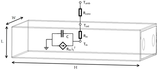 Figure 2 bounds the geometric representation of a cell with the electrothermal circuit that implements Equations (3) and (4), while Figure 3 compares the same circuit with a schematic representation of this model in our simulation environment (the SystemC-WMS), described in the next section.