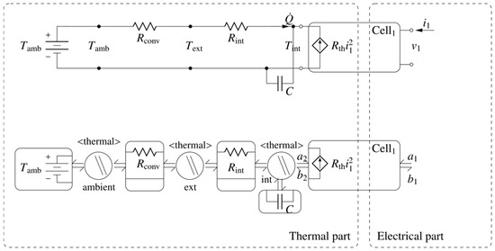 The typical electrical equivalent model consists of a voltage source in series with a resistance and a number (usually from 0 to 3) of resistors and capacitors connected in parallel. This model has been widely used [8,9,10,11,12,13,14,15,16,17]. The electrical part of the proposed model of a single battery cell is based on the schematic reported in Figure 1a.
